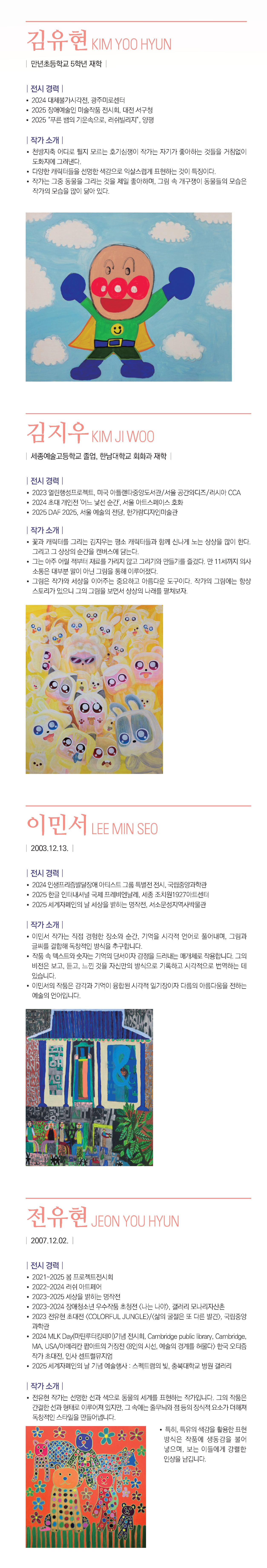 - 충남역사문화연구원(원장 장기승) 산하 충남역사박물관은 발달장애 예술가들의 삶과 예술적 열정을 담은 기획특별전 ‘Hi_story’를 오는 9월 26일 오후 3시, 박물관 1층 기획특별전시실에서 개최한다. 이번 전시는 발달장애 예술가들의 독창적인 예술 세계를 조명하고, 사회 전반에 걸쳐 포용과 다양성의 가치를 확산하기 위해 마련되었다.