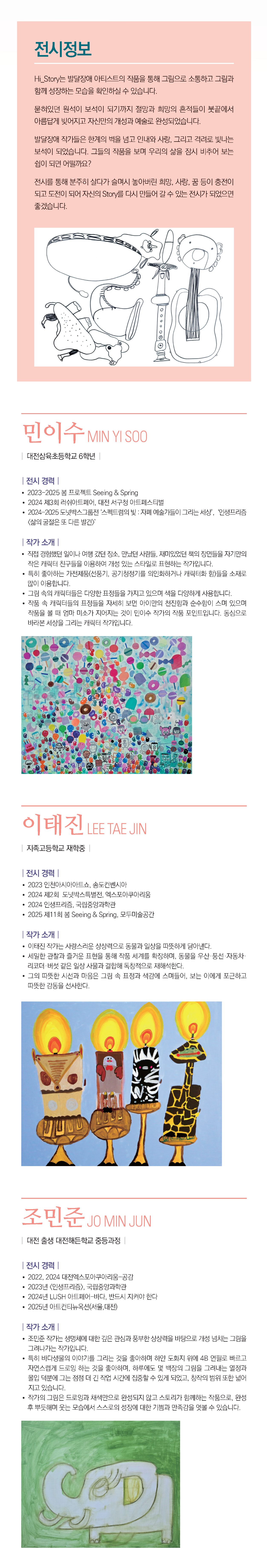 - 전시명 ‘Hi_story’는 ‘나의 이야기(Hi-story)’와 ‘역사(History)’라는 중의적 의미를 담고 있다. 이는 개별 예술가의 서사가 모여 하나의 시대적 문화 흐름을 형성하고, 결과적으로 새로운 역사를 만들어간다는 점을 강조한다. 특히 발달장애 예술가들이 각자의 방식으로 세상과 소통하며 남긴 흔적을 통해, 예술이 개인을 넘어 공동체의 기억을 확장하는 매개체가 될 수 있음을 보여준다.